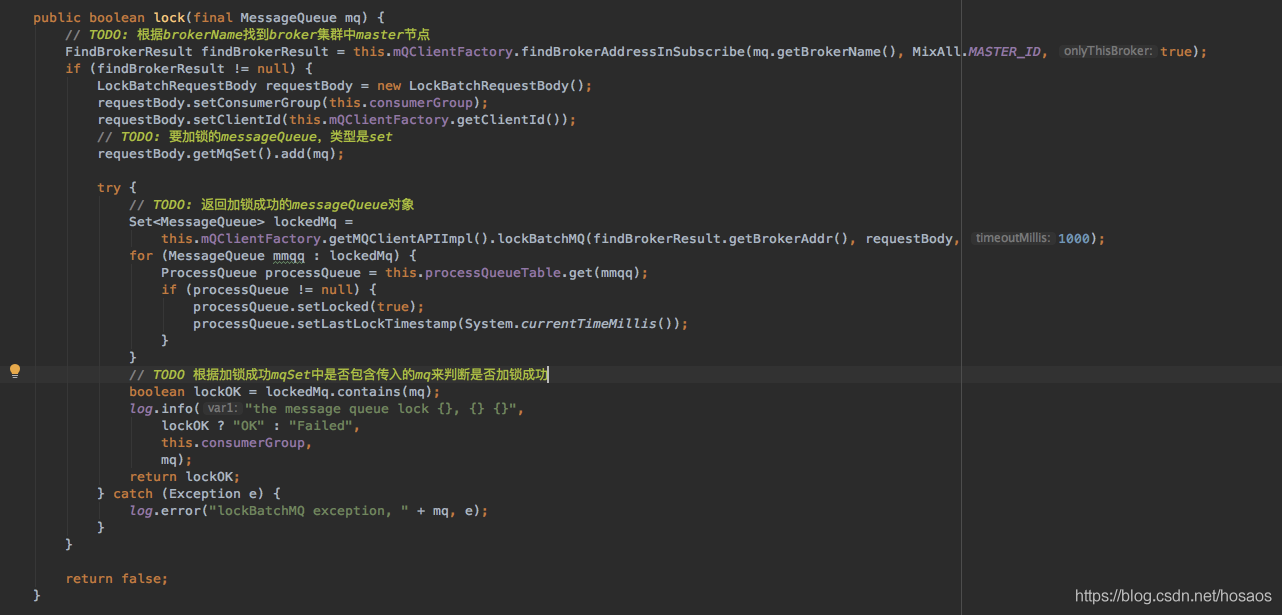 核心思想就是,消费客户端先向broker端发起对messageQueue的加锁请求,只有加锁成功时才创建pullRequest进行消息拉取,下面看下lock加锁请求方法