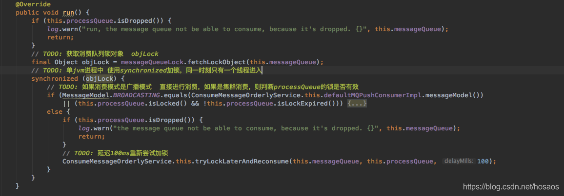 消费者重新负载,并且分配完消费队列后,需要向mq服务器发起消息拉取请求,代码实现在RebalanceImpl#updateProcessQueueTableInRebalance中,针对顺序消息的消息拉取,mq做了如下判断
