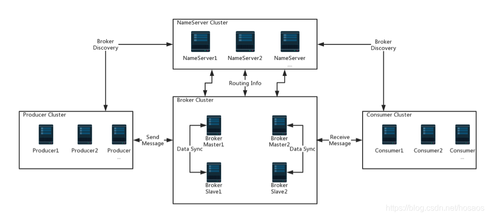 - NameServer:注册中心和配置中心,管理集群的元数据,包括 Topic 信息和路由信息、Producer 和 Consumer 的客户端注册信息、Broker 的注册信息。是一个几乎无状态节点,可集群部署,节点之间无任何信息同步。