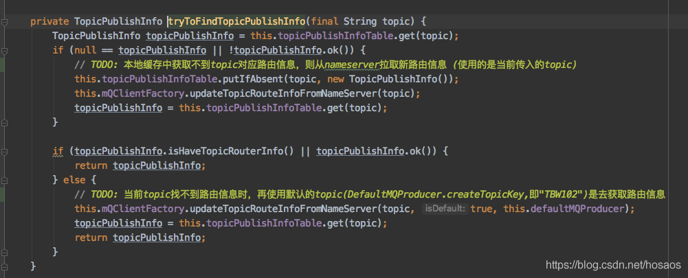 对应到代码里的实现如下org.apache.rocketmq.client.impl.producer.DefaultMQProducerImpl#tryToFindTopicPublishInfo