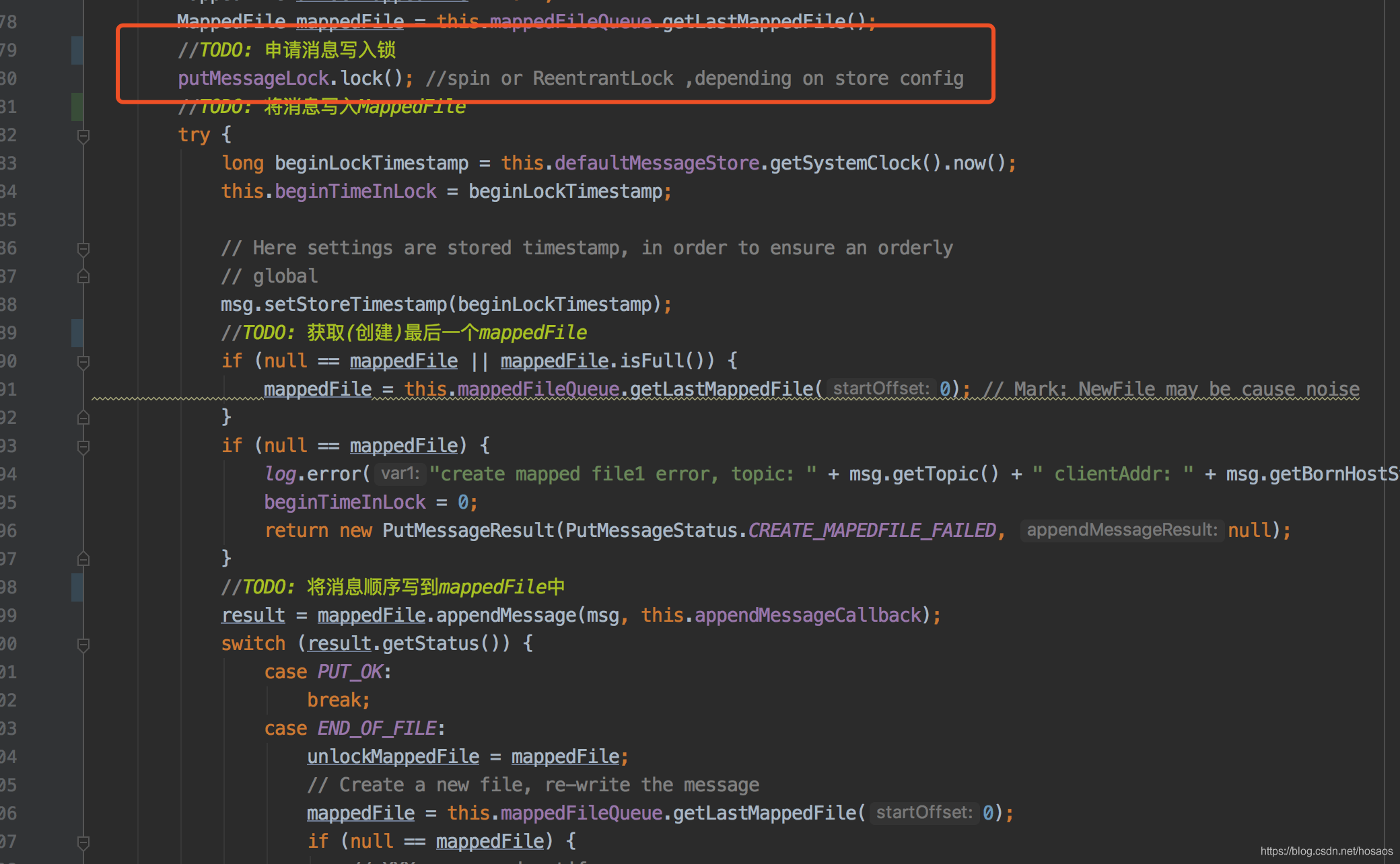 消息是并发到达Broker端的,那么如何保证所有消息顺序写入CommitLog文件呢,一个很自然的做法就是加锁,将消息写入过程通过锁变成串行执行,那么RocketMq中是如何加锁的呢?Synchronized?ReentrantLock?