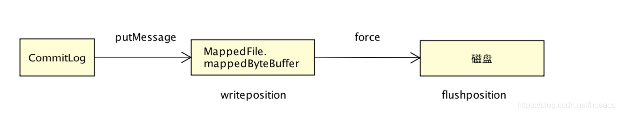 消息追加时,直接存入 MappedByteBuffer(pageCache) 中,然后定时 flush,这种很好理解,和同步刷盘相比,只是依赖定时器来定时将MappedByteBuffer中的消息数据刷入磁盘中,流程与同步刷盘差不多