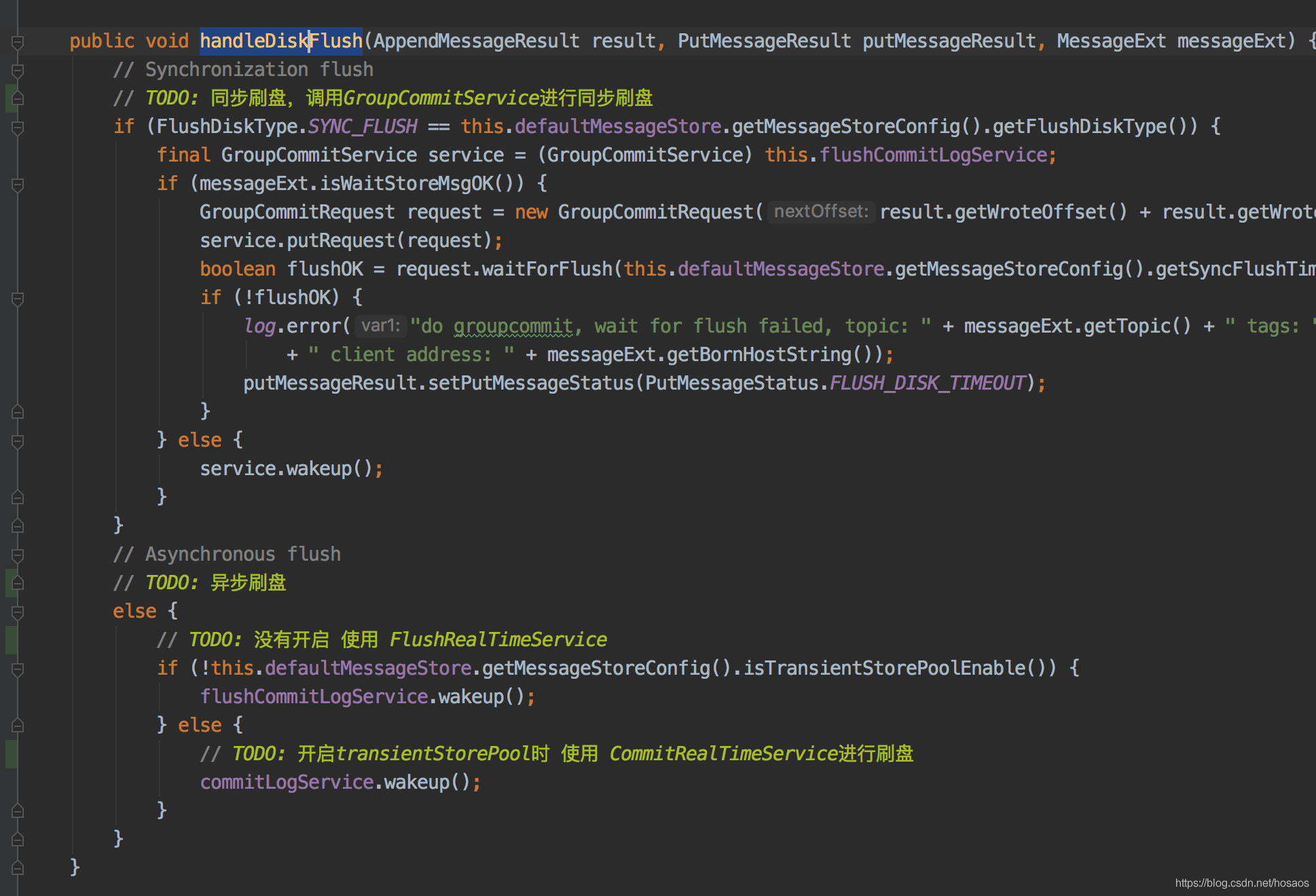消息写入pageCache后,自然是要进行刷盘操作的,RocketMq中提供了同步刷盘、异步刷盘2种刷盘策略,刷盘代码在org.apache.rocketmq.store.CommitLog#handleDiskFlush中,实现如下