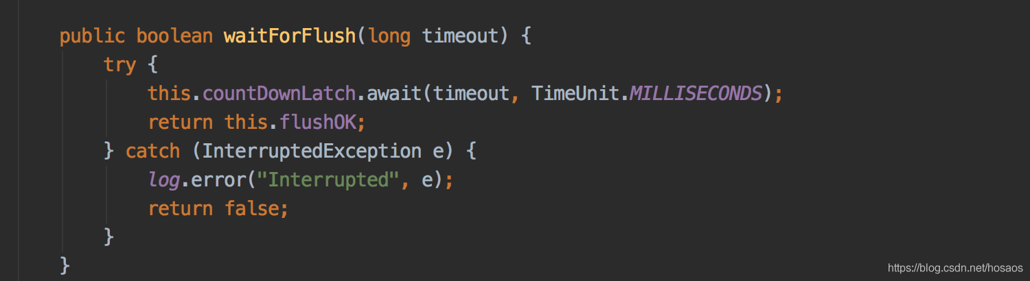 同步刷盘:每次发送消息,消息都直接存储在 MappedFile 的 mappdByteBuffer,然后直接调用 force() 方法刷写到磁盘,等到 force 刷盘成功后,再返回给调用方(GroupCommitRequest#waitForFlush)就是其同步调用的实现,本质上是使用CountdownLatch来实现的同步等待及唤醒
