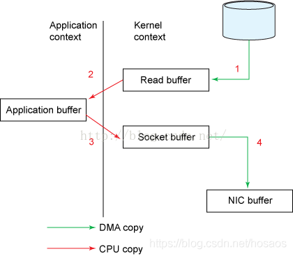 正常情况下,将磁盘文件中读取数据,并且将数据发送到socket中,是如图所示的一个流转情况