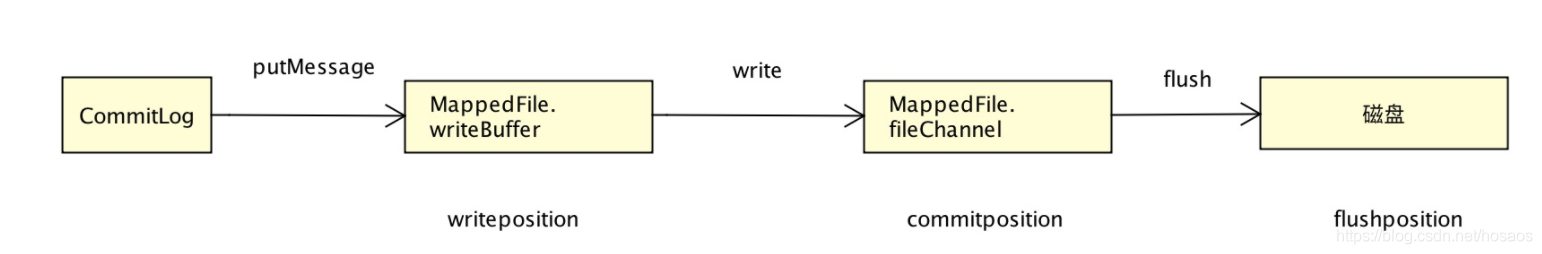 开启该参数情况下,消息在追加时,先放入到堆外内存writeBuffer 中,然后定时 commit 到 FileChannel,然后定时flush,流程图如下