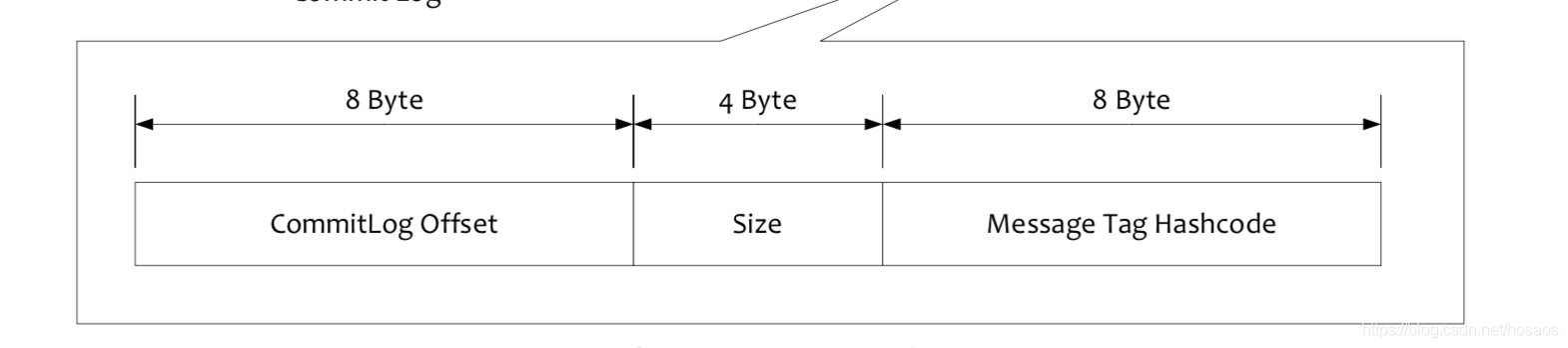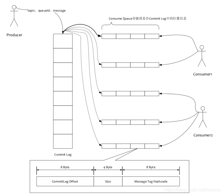 那么这个过滤是在Broker服务端进行的,还是消费端进行的呢?再回顾下ConsumerQueue的存储结构,如图所示,每个消息是个定长的存储结构,CommitLog OffSet存储消息在实际磁盘文件CommitLog中的偏移量,Tag HashCode存储消息体中tag 的hash值(如果直接存储tag就不能达到定长的要求了)