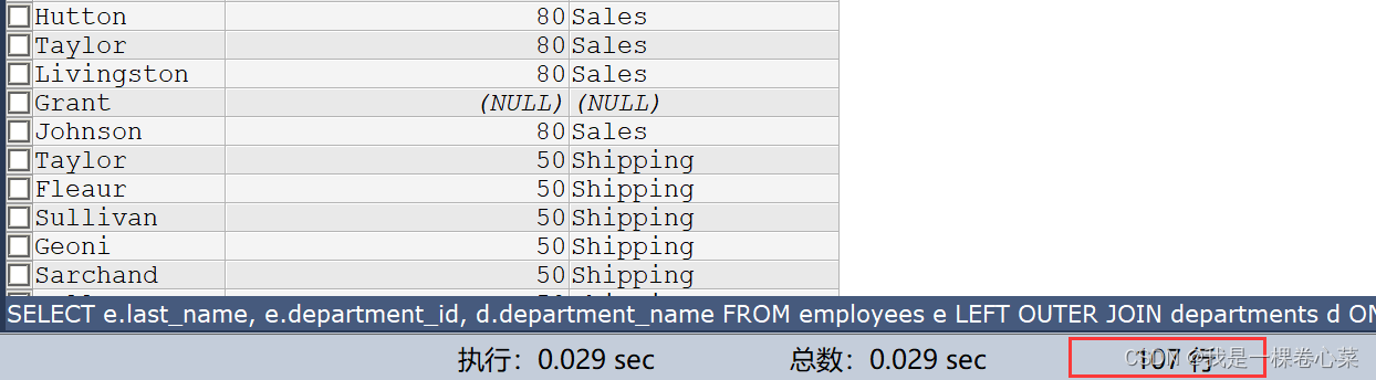需要注意的是:因为有的员工没有部门,所以当使用左外连接时,会查到107条记录;若使用的是内连接查询,就会有少一条记录,从这里就应该明白内连接与外连接的根本区别。