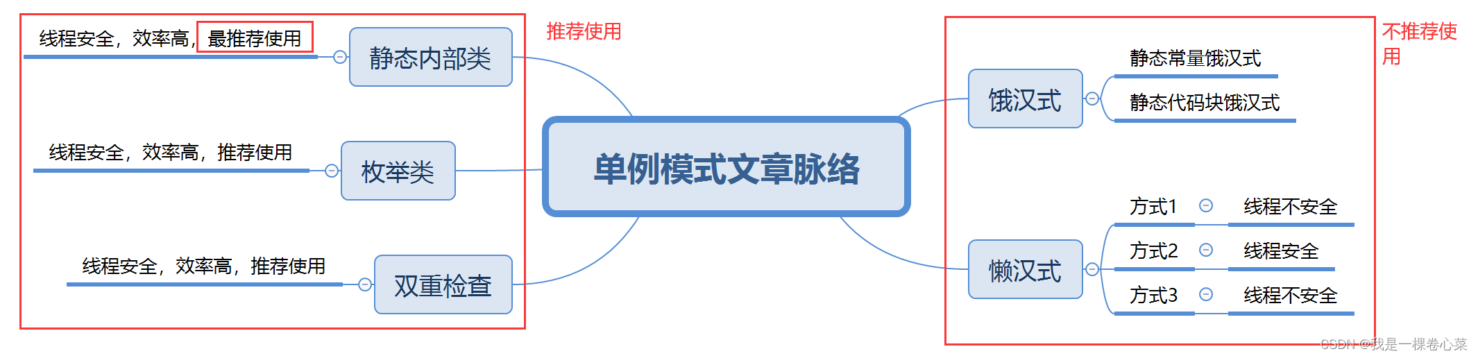 线程安全,采用了类装载的机制来保证初始化实例时只有一个线程,效率高;静态内部类方式在Singleton类被装载时并不会立即实例化,而是在需要实例化时,调用getInstance方法,才会装载SingletonInstance类,从而完成Singleton的实例化,推荐使用