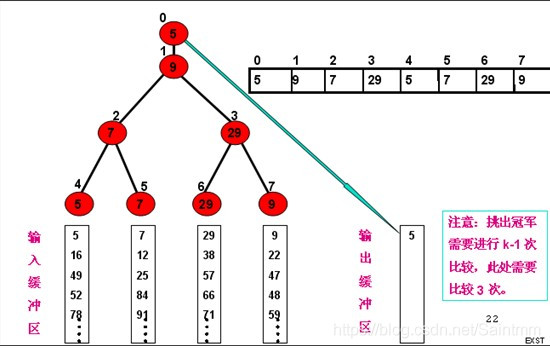每路的第一个元素为胜利树的叶子节点,(5,7)比较出5胜出7失败成为其根节点,(29,9)比较9胜出29失败成为其根节点,胜者(5,9)进行下次的比赛9失败成为其根节点5胜出输出到输出缓冲区。由第一路归并段输出,所有将第一路归并段的第二个元素加到叶子节点如下图: