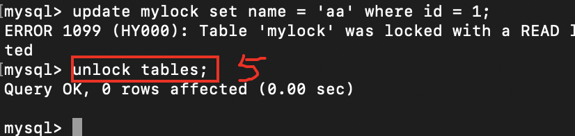 | 当前session插入或者更新表会提示错误 insert into mylock values(6,‘f’) Table ‘mylock’ was locked with a READ lock and can’t be updated update mylock set name=‘aa’ where id = 1; Table ‘mylock’ was locked with a READ lock and can’t be updated | 当前session插入数据会等待获得锁 insert into mylock values(6,‘f’); |