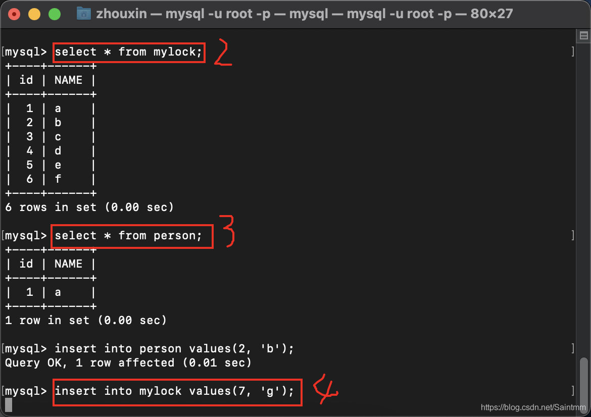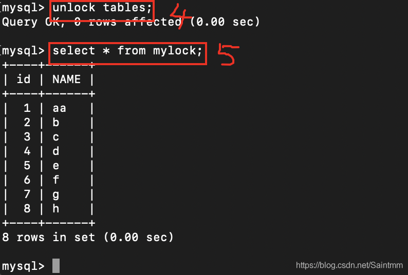 | 当前session对表的查询,插入,更新操作都可以执行 select * from mylock; insert into mylock values(5,‘e’); | 当前session对表的查询会被阻塞 select * from mylock; |