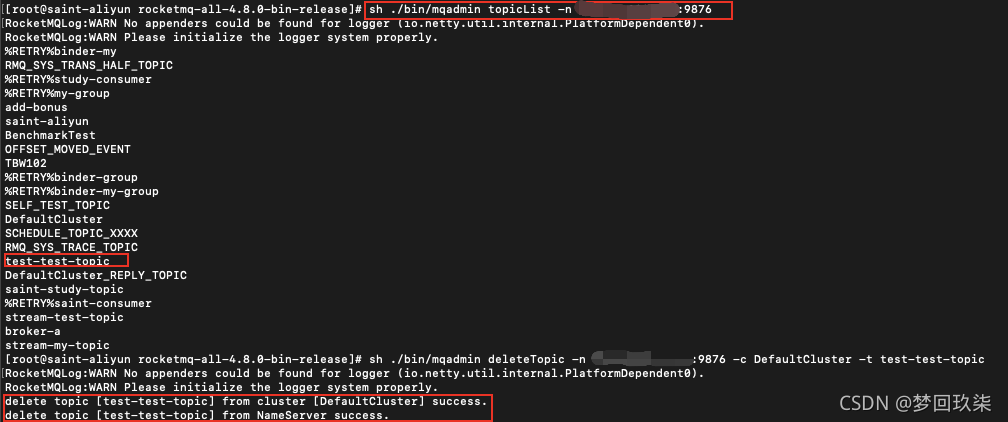 sh ./bin/mqadmin deleteTopic -n localhost:9876 -c DefaultCluster -t test-test-topic
