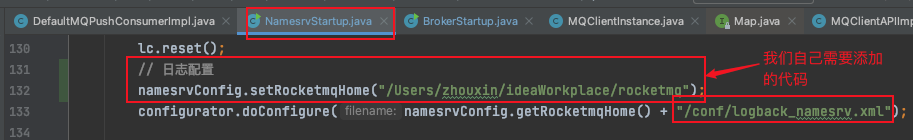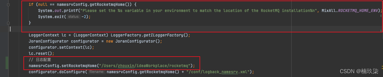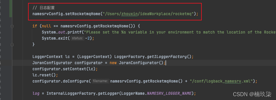 (1)在NamesrvStartup#main()方法套娃的createNamesrvController()方法中可以看到有一个引入/conf/logback_namesrv.xml文件的操作: