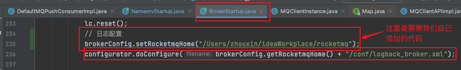启动之前我们先把代码中RocketmqHome的配置往上挪一挪(因为和上面我们启动NameServer的时候存在同样的ROCKETMQ_HOME不存在的问题):
