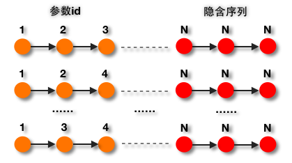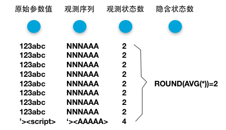 如果我们把参数id的每个参数值看作一个序列(Sequence),那么参数值中的每个字符就是这个序列中的一个状态(State)。同时,对于一个序列,为123或者124甚至是345,其背后所表达的安全上的解释都是「数字 数字 数字」,我们用「N」来表示「数字」,这样就得到了对应的隐含序列。