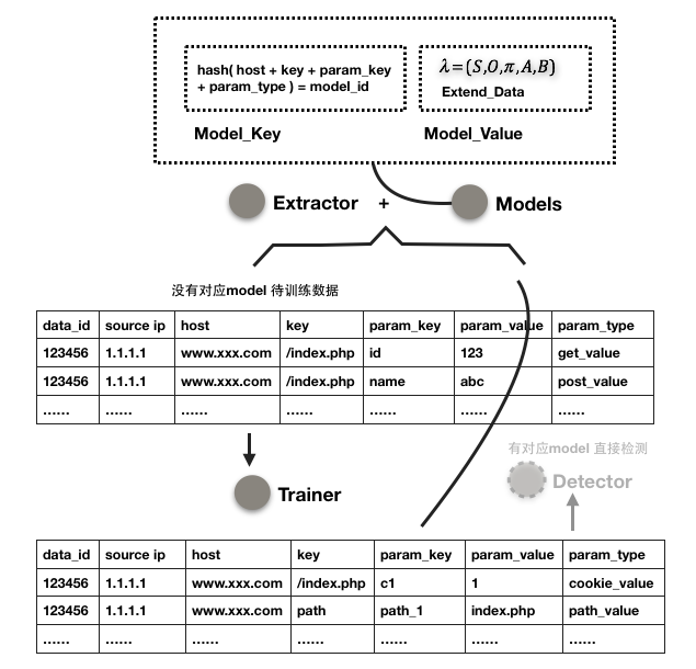 「Trainer」部分结束后,开始「Detector」部分。从「Extractor」出来的有对应Model的数据,直接开始检测,如果概率P<异常概率阈值H – epsilon小量,则认为是异常,epsilon = (1/100) H。异常的数据最终再由data_id还原出对应的原始Http数据。