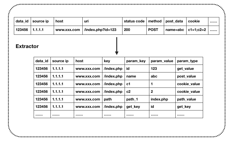 对每条Http原始日志,先经过Extractor进行参数拆解,各种ETL,解码等处理。这一步是最容易描述但确是最难做好的。比如URL中虽然都是百分号编码,但字符集却有GBK、UTF-8、GB2312等等,如何选择正确的字符集来解码?再比如POST传递参数,可以通过urlencoded、multipart/form-data、json或xml等,如何保证能够正确的提取?