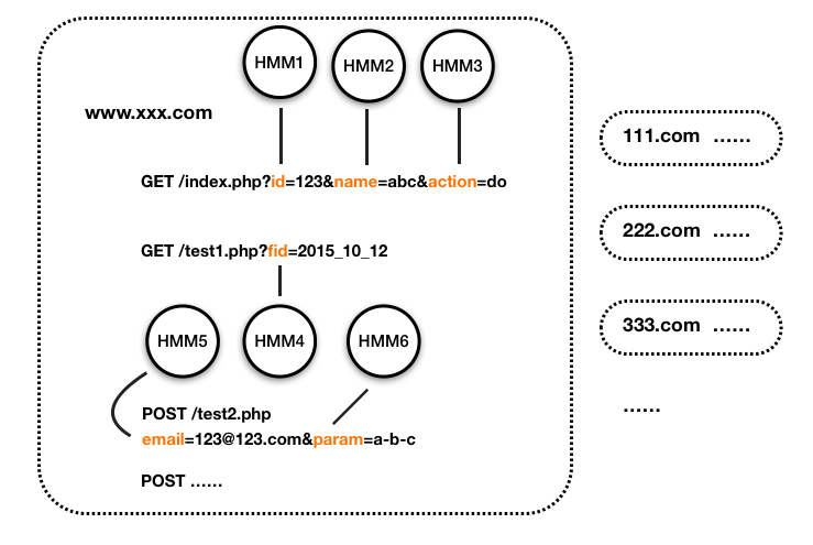 这里我们只用得到后两个。在训练阶段,对应「学习问题」,用大量正常的参数值训练出站点www.xxx.com下index.php下的参数id的HMM模型;在检测阶段,对应「评估问题」,待检测的参数值带入模型检测是否是正常。