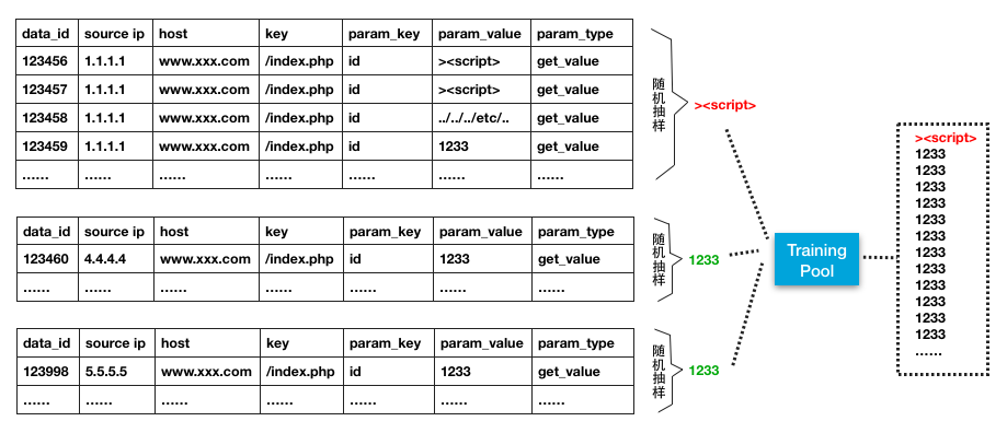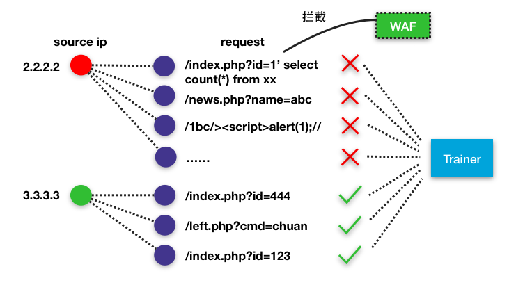 第一步,对某个ip,只要其当天内所有请求中有一条命中了WAF,其余所有请求不管是正常的还是异常的,均不进入Trainer;如果某个ip命中扫描器特征或扫描器行为(这个模型将在另外一篇文章中介绍),该ip所有请求也不进入Trainer。