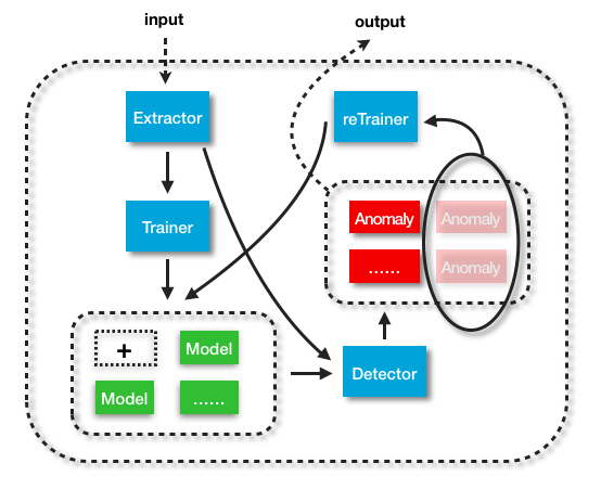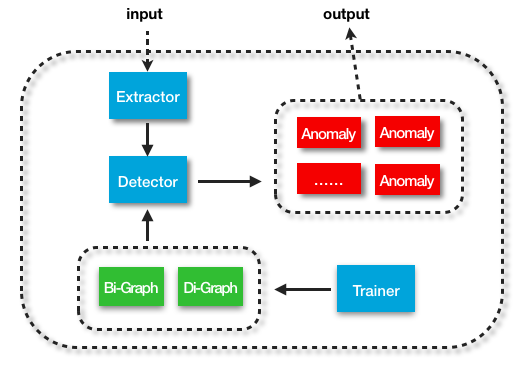 整个模型包含4个主要模块,抽取器「Extractor」、训练器「Trainer」、检测器「Detector」、重训练器「reTrainer」。