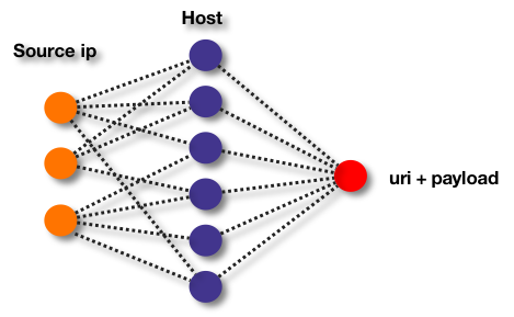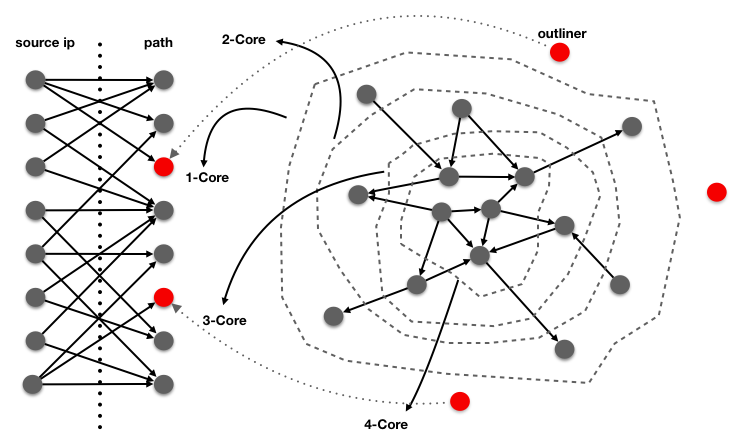 通常一个异常节点(如Webshell),大多数正常人是不会去访问的,只有少量的攻击者会去访问(这里不考虑修改页面写入webshell的情况,这个模型不能覆盖这类case)。用一个简单的二部有向图就能很好表达。入度越少的节点,同样越有可能是异常。