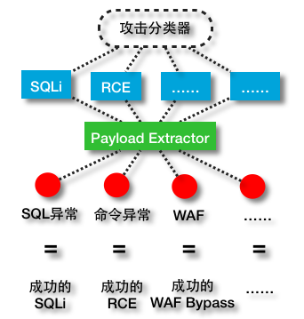 所以我们想尝试在参数异常数据的基础上,注入一些领域知识,从而构成一个分类器,从异常中剥离出攻击,并且能够对不同种类的攻击进行分类。但我们又不太想人为构造样本人工打标记,因为这样又会带来一些个体因素的影响,我们希望能用真实世界中的流量来获得领域知识。