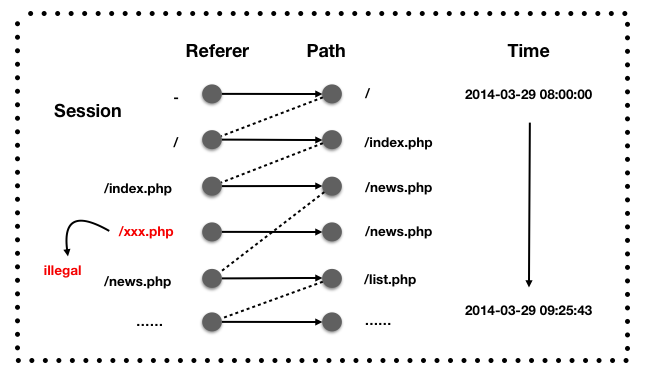 先做一个session identification,对每个session块中的数据,分析其导航模式。正常的referer必然会出现在当前session中之前的path数据中,同时,能够与当前session之前的数据形成连通路径。当然,导航模式并不能完全检测所有的伪造referer,攻击者完全可以先访问A,再构造一个referer为A访问B的请求。不过没关系,后面还有方法能避免这些数据进入Trainer。