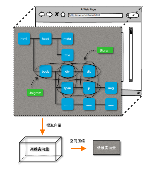 每个tag作为一元gram,相邻兄弟tag和相邻父子tag作为二元gram,去除掉如html、head、body之类的通用tag。同时,仅仅使用tag名称会损失掉很多表达结构样式的信息,所以我们取tag+部分表达格式的属性,hash之后映射到某一维度。同时,对不同的gram赋予不同的权值,用来体现其表达结构特点的能力,最终得到一个高维实向量。