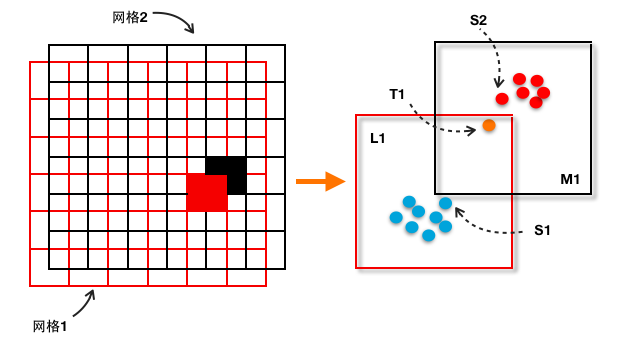 如图T1是待检测网页的特征向量,在红色网格中,命中了超网格L1,进而找到在红色网格中最相似样本为S1。而在黑色网格中,同样的方法找到了样本S2。最终再来比较与S1、S2的伪距离,得到最相似样本S2。