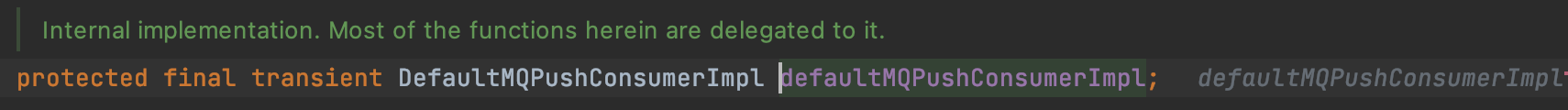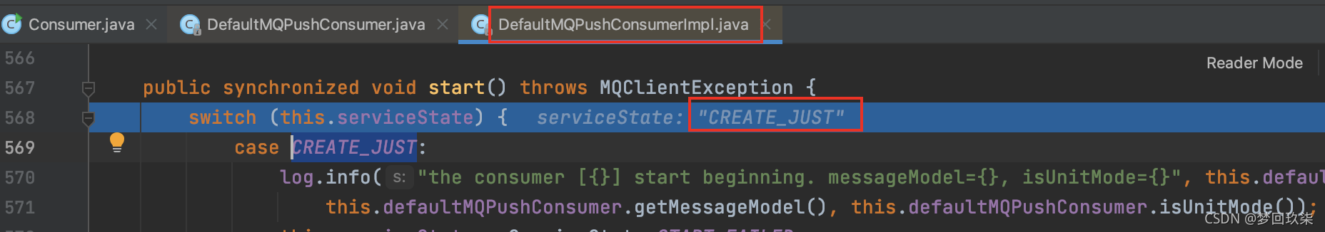 在consumer.start()行我们F7进入方法发现它所有的逻辑都是DefaultMQPushConsumerImpl类中的start()方法中做的,从这里我们可以确定入口就是DefaultMQPushConsumerImpl#start()。