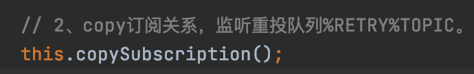 (3)第二步:复制copy订阅关系,监听重投队列%RETRY%TOPIC。这一步对于我们整体consumer的启动流程来讲意义不大,所以不要专进入、不要专进入、不要专进入。重要的事说三遍。