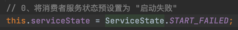 (1)将消费者服务状态预设置为 “启动失败”。这个操作相信很多看过JUC的源码的大佬都会记得,JUC坐着道格.李老爷子的编程习惯:先预置状态,后续逻辑成功直接提交,否者就回滚。