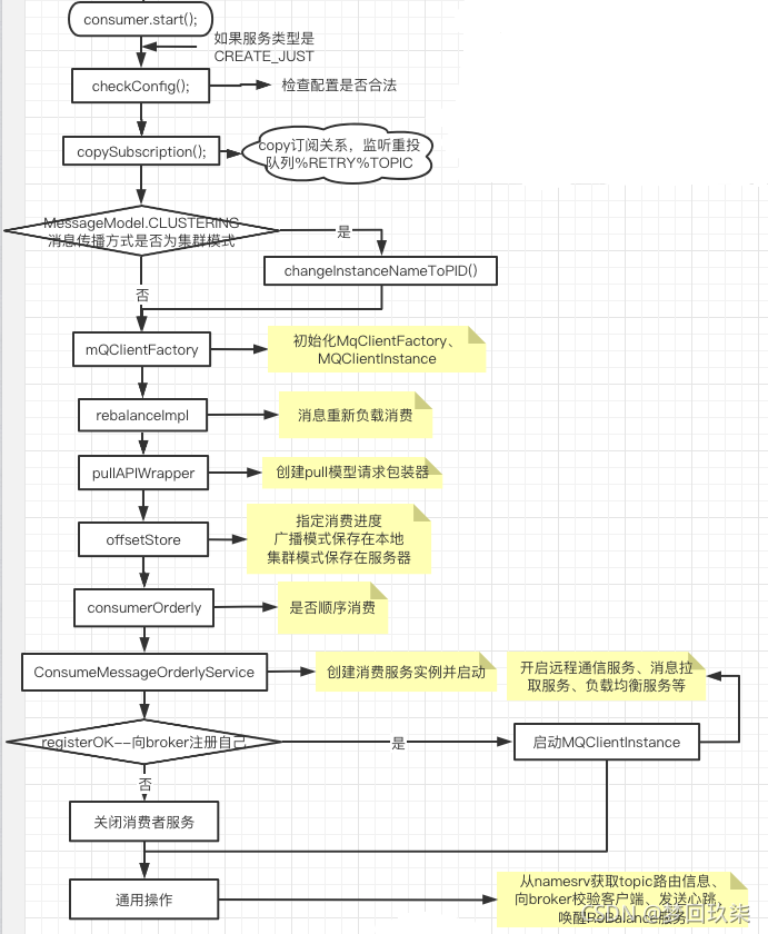 (2)然后我们真正进入RocketMQ的启动流程,第一步是很常规的校验操作,校验一堆配置,比如:consumerGroup配置规则、消息传播方式不能为null(默认为集群消费–CLUSTERING)、并发消费线程数量等。感兴趣的老哥可以自己跟进去,你会发现这个逻辑太像我们平时写的代码了。