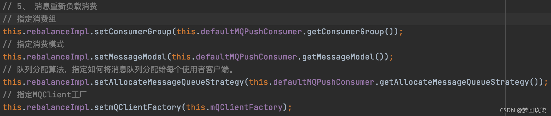 (6)第五步:指定消息重新重新负载的相关配置,比如:消费组、消息传播方式、队列负载策略、MQClient工厂等。
