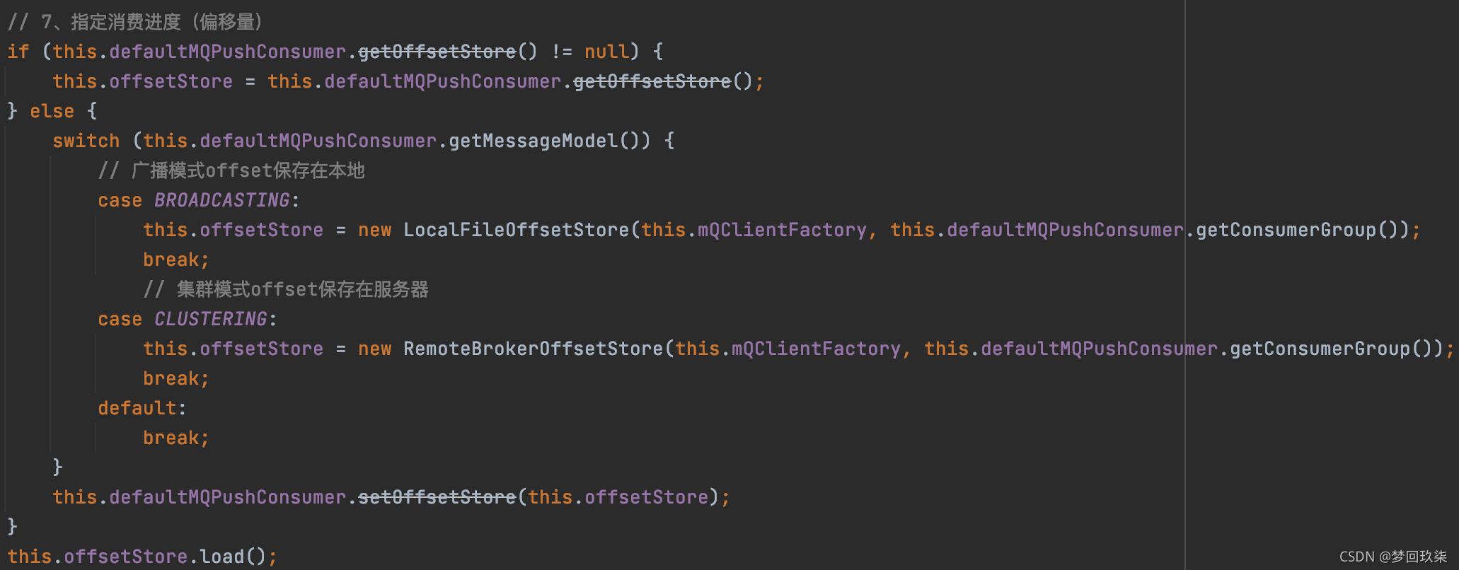 (8)第七步:指定消息消费进度OffsetStore对象,初始化消息消费进度。集群模式下消息消费进度offset保存在broker、广播模式下消息消费进度offset保存在client消费者端,即本地文件中。如果是广播模式,紧接着会从本磁盘中加载消费进度文件。