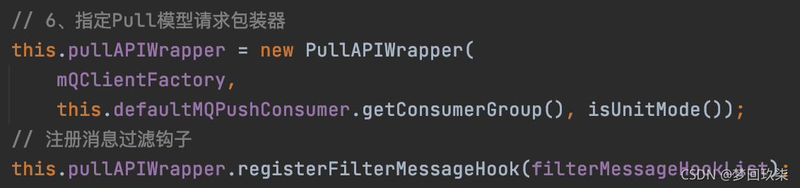 (7)第六步:指定创建Pull模型请求包装器(PullAPIWrapper),它是拉取Broker消息的API操作包装器。