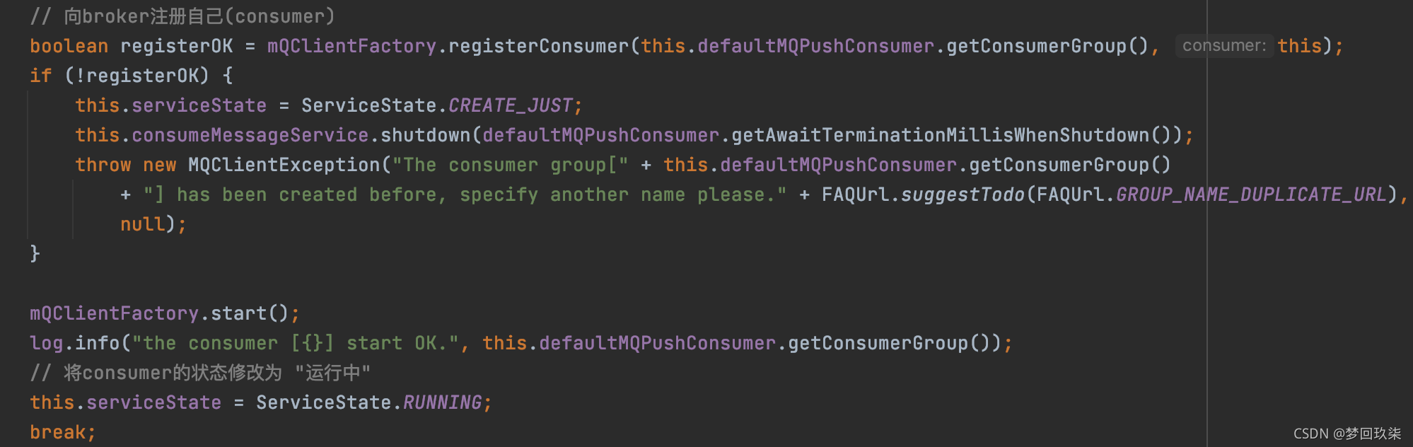 (10)第九步:consumer向broker注册自己,注册失败则将consumer服务实例的状态回滚到CREATE_JUST,并将已经启动的消费消息的定时任务取消。否则将consumer的状态修改为RUNNING,并启动MQClientInstance。