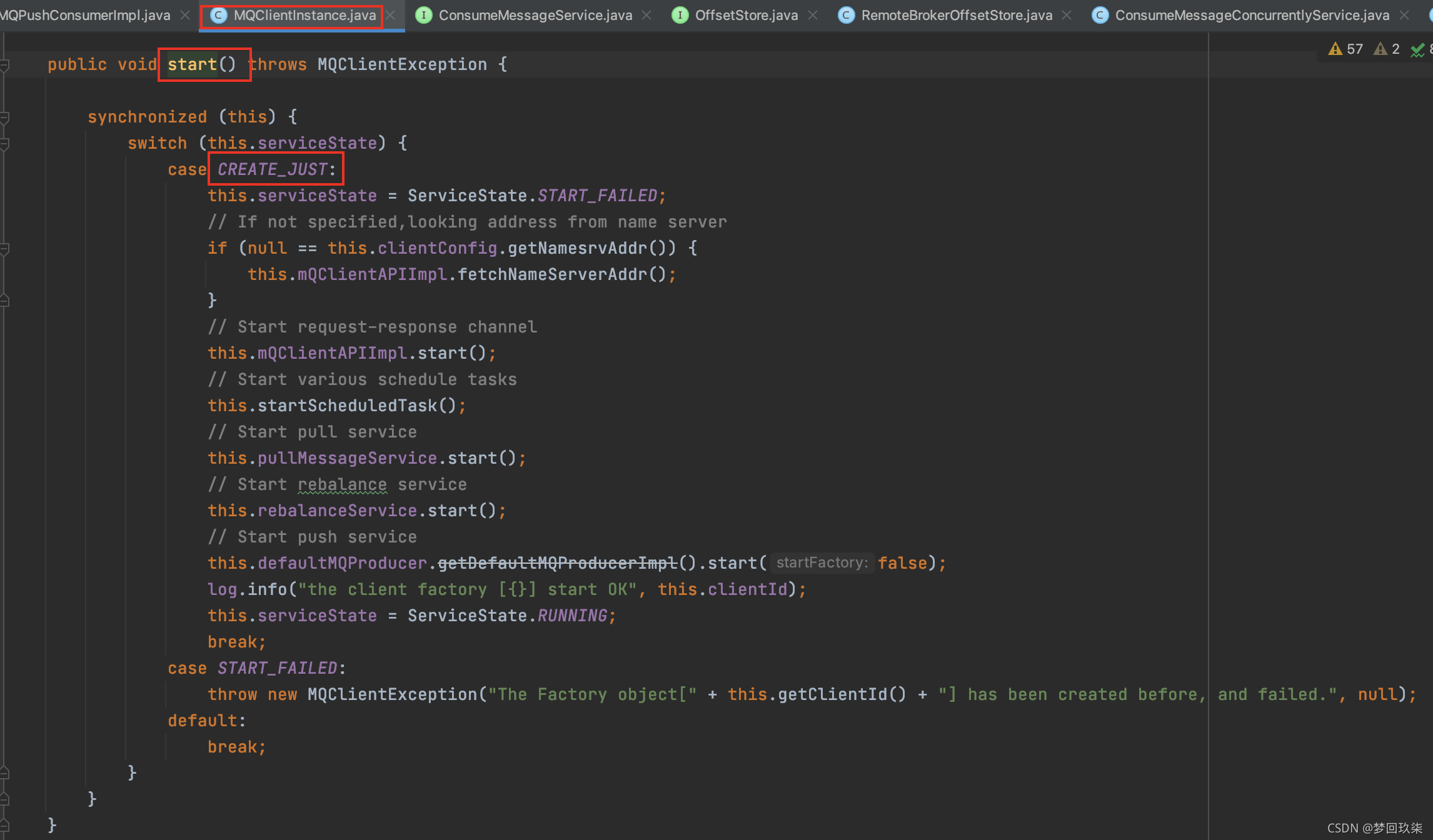 从代码上来看,几乎和DefaultMQPushConsumerImpl类的start()方法一样,区别在于DefaultMQPullConsumerImpl类的start()方法中在switch case逻辑后多了如下片段: