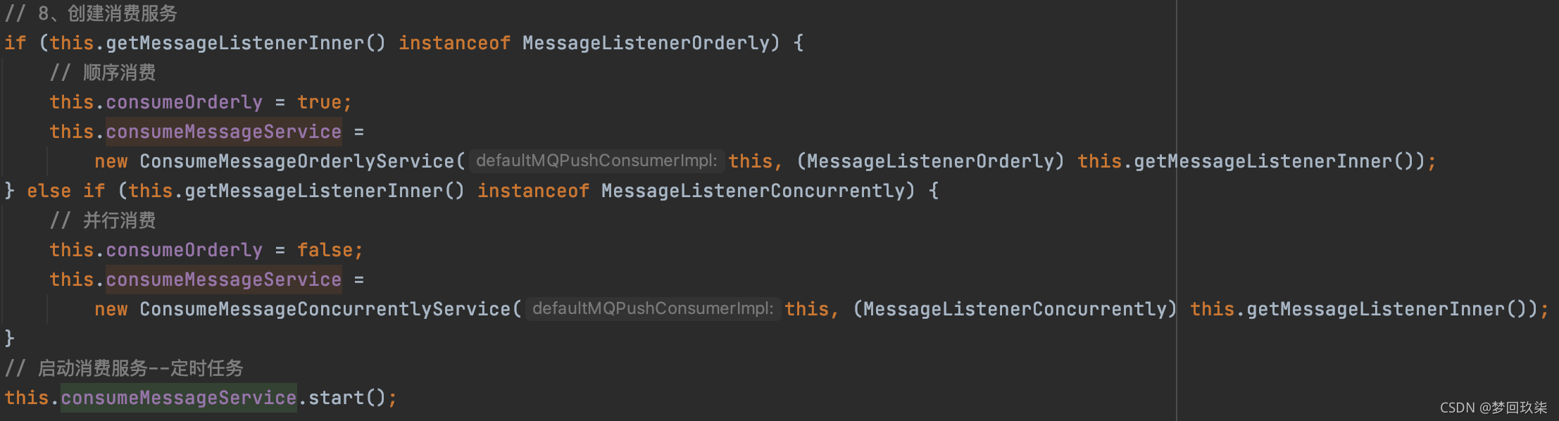 (9)第八步:根据是否为顺序消费创建ConsumeMessageOrderlyService实现或ConsumeMessageConcurrentlyService实现的不同ConsumeMessageService对象并开启消费消息服务----这是个定时任务。consumeMessageService主要负责消息消费,内部维护一个线程池,可以通过参数配置最大和最小核心线程数、注意的它的阻塞队列是无界的。