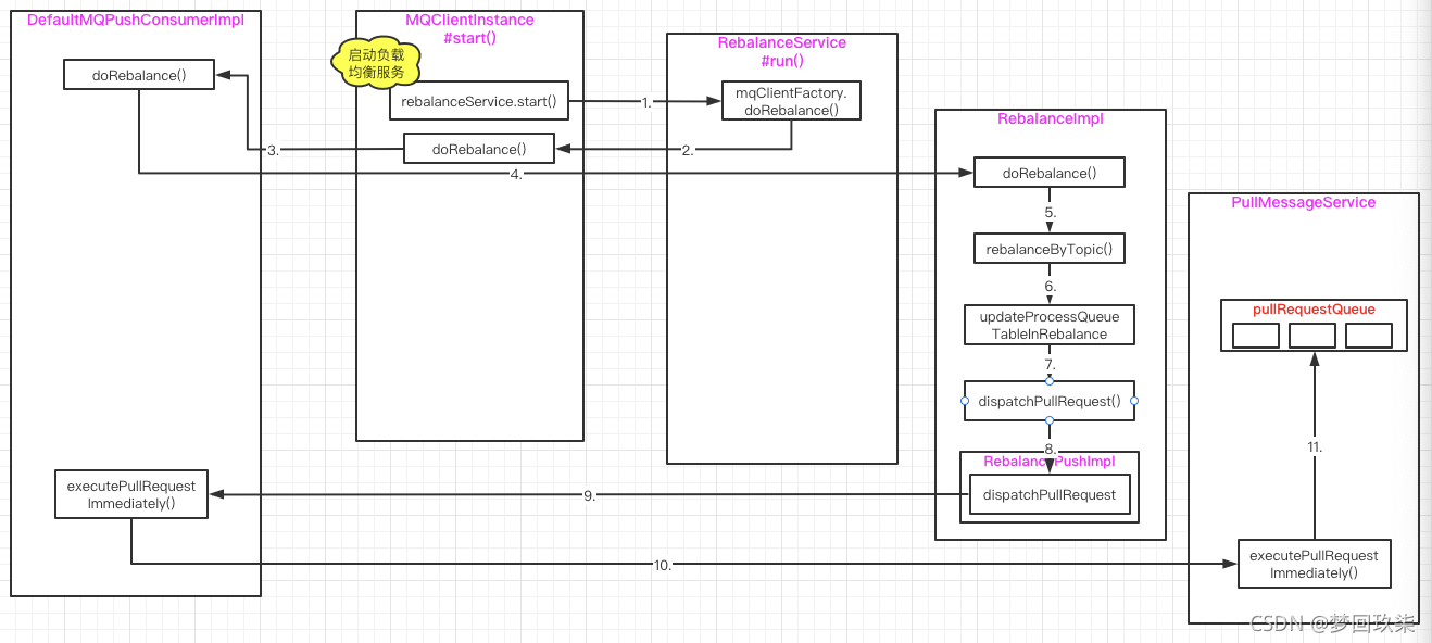 从这里可以看到RebalanceService这个负载均衡线程实在MQClientInstance的start()方法中启动的,对于MQClientInstance的start()是在哪里调的,我们在之前的文章中已经聊过:是DefaultMQPushConsumerImpl#start()启动消费者的时候调用的。
