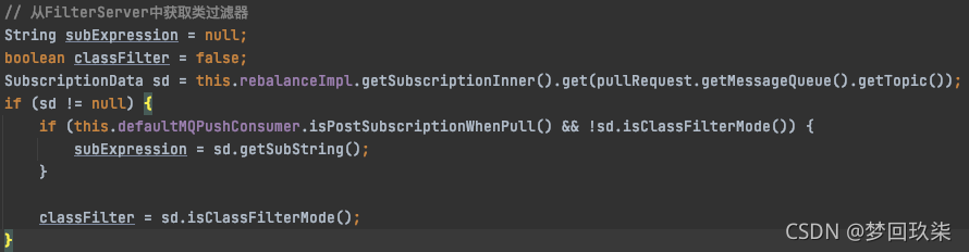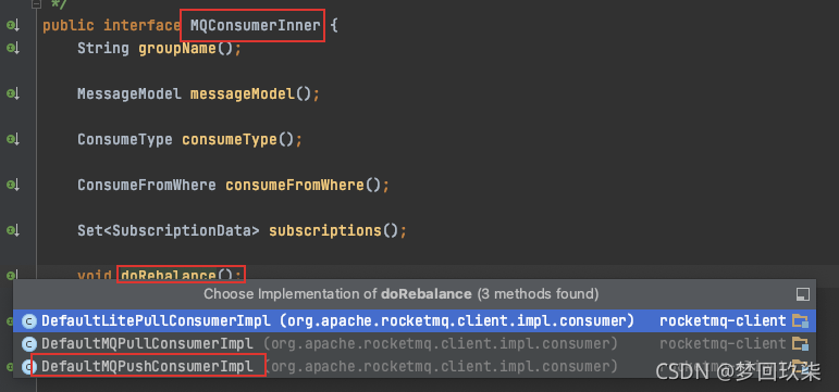 而MQConsumerInner是一个接口,我们需要去它的实现中看具体的实现逻辑。此处我们仍以Push模式为例,即DefaultMQPushConsumerImpl。