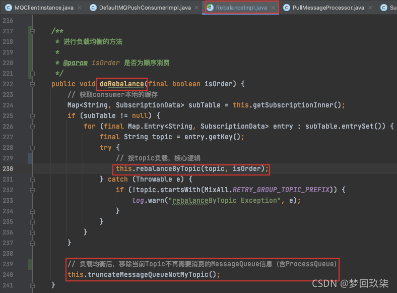 在RebalanceImpl类中,doRebalance()方法一方面要以topic为维度进行consumer负载均衡,一方面要在负载均衡后,移除topic中不需要再消费的MessageQueue信息(ProcessQueue)。
