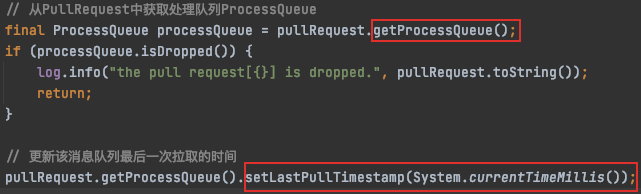 然而truncateMessageQueueNotMyTopic()方法中实际并没有操作pullRequestQueue这个阻塞队列中的PullRequest,只是将MessageQueue关联的ProcessQueue从processQueueTable中移除,并将ProcessQueue设置为drop状态。