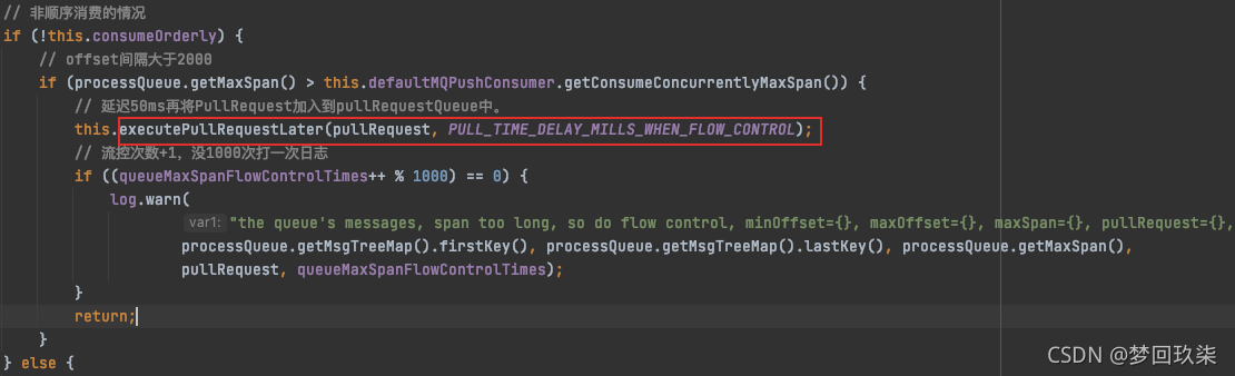3)非顺序消费时,如果拉取到的一批消息之间的offset大于2000,延时50ms将PullRequest放入到pullRequestQueue中。