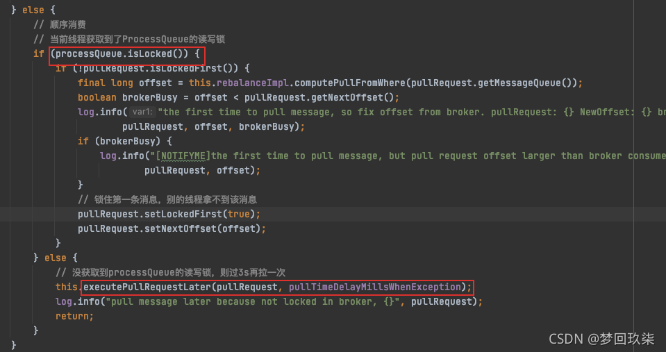 4)顺序消费时,如果当前线程没有获取到ProcessQueue的读写锁,延时3s将PullRequest放入到pullRequestQueue中。
