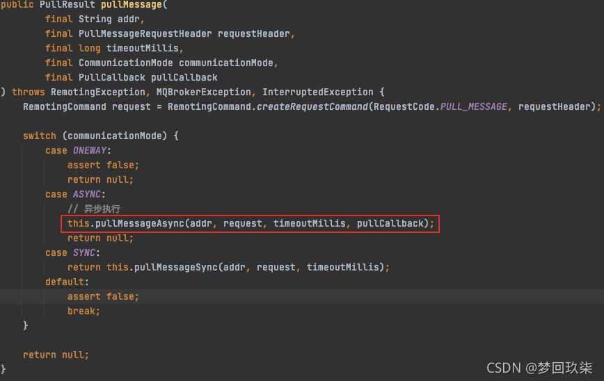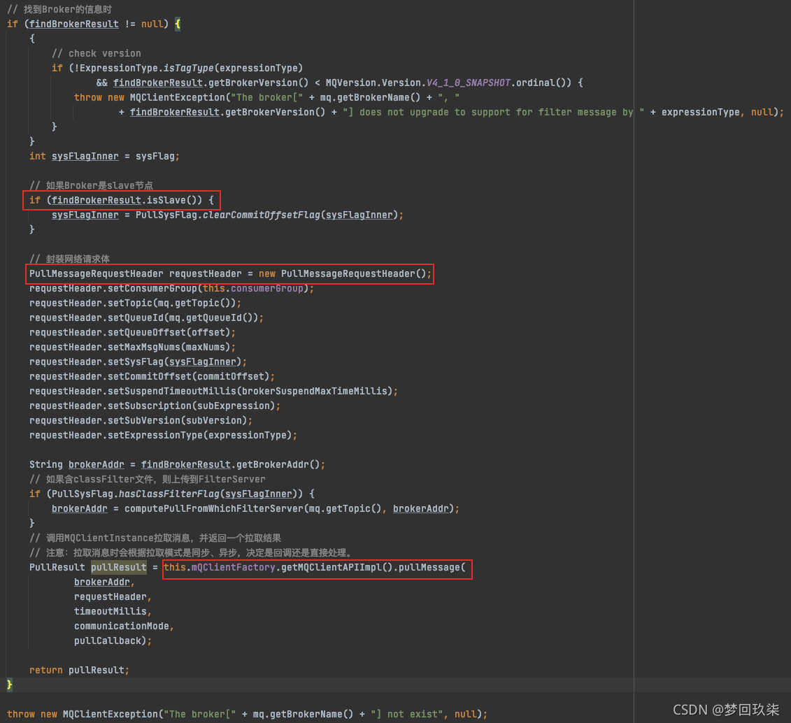 (1)MQClientAPIImpl#pullMessage()方法如下: