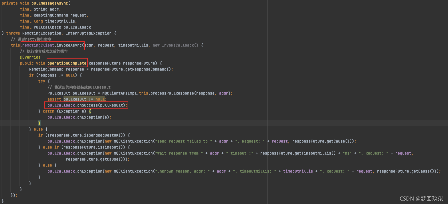拉取消息,会根据拉取模式,是同步还是异步,调用MQClientAPIImpl回调或直接处理。由于前面传过来的CommunicationMode为ASYNC,即异步。所以我们着重看一下MQClientAPIImpl中异步拉取消息的逻辑。