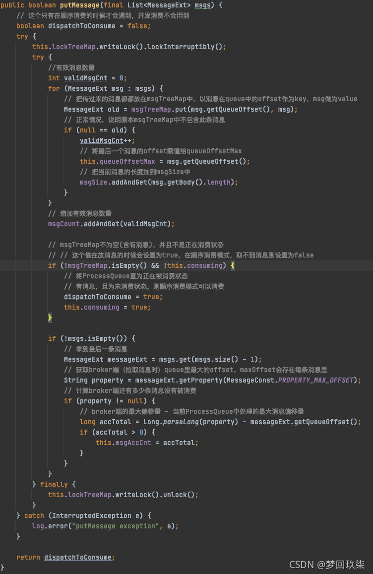 第一步:将拉取到的消息放入到ProcessQueue中,即将消息加入到ProcessQueue的msgTreeMap红黑树容器中。